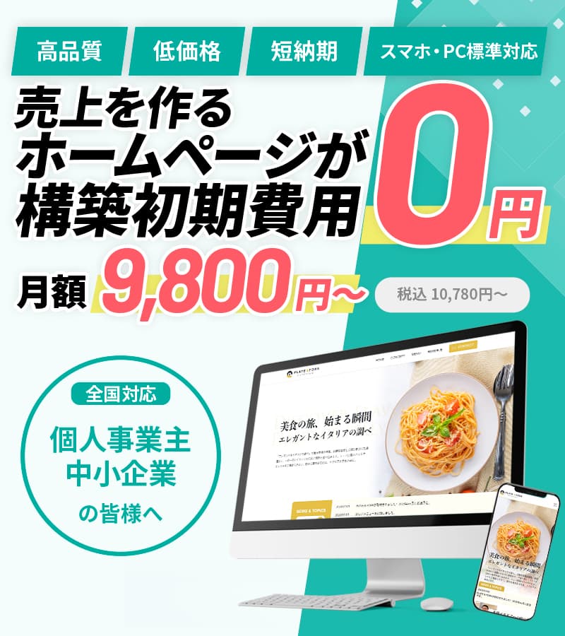 お客様のご要望に合わせてプロのデザイナーがハイクオリティなホームページに仕上げても、驚きの初期費用0円!難しい料金形態もなく、月々9,800円+税からだけでホームページの構築が可能です。